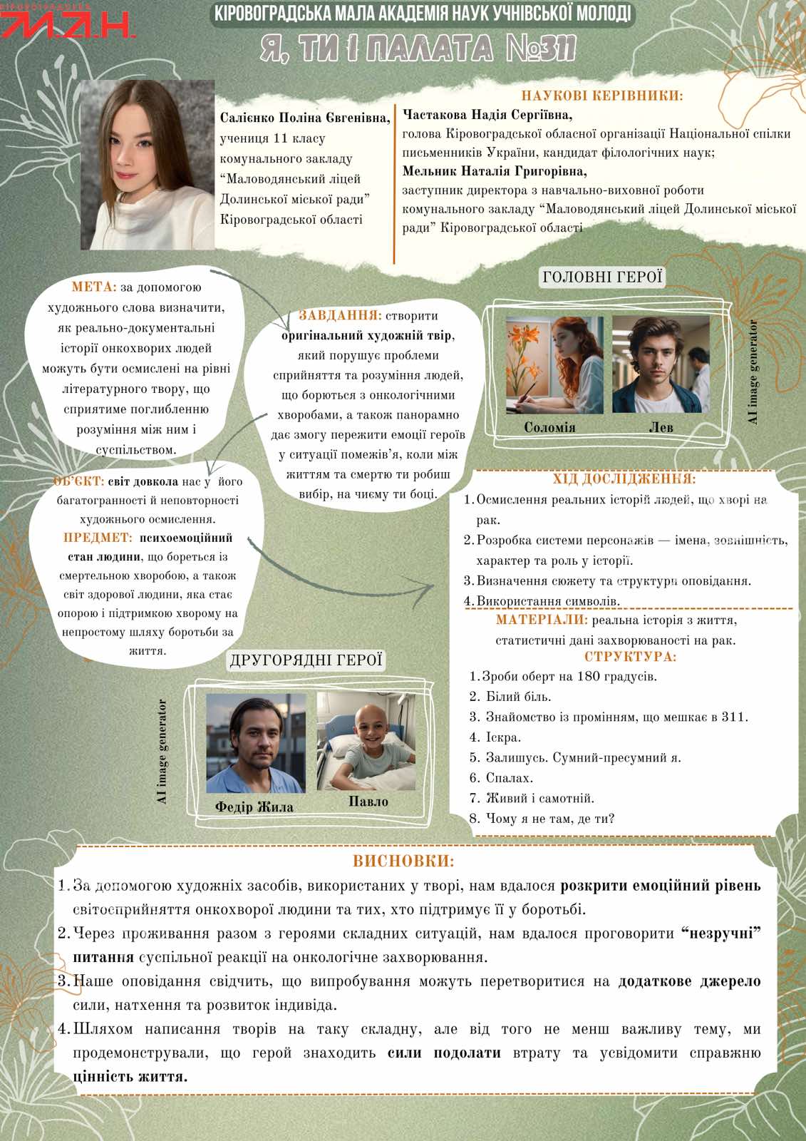 Дослідницьку роботу присвячено осмисленню того, як ми сприймаємо людей, що борються з онкологічними захворюваннями, наскільки ми здатні зрозуміти іншого, чи здатні бути толерантними до ближнього і як в ситуації помежів’я ми сприймаємо смерть. Багатогранний світ, сповнений багатьох радостей і принад, воднораз змінює свої кольори і відтінки не лише для людини, яка стає на шлях боротьби з хворобою, а й для її рідних, друзів. Саме тому важливо розуміти іншого, шукати в собі духовний ресурс, аби лікування перетворювалось на процес зцілення.